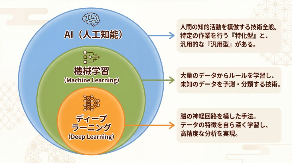 AIの仕組みを掴む上で、AIという大きな概念の中に「機械学習」があり、さらにその一手法として「ディープラーニング(深層学習)」が存在するという関係性の理解が非常に重要です。これらは包含関係にあり、それぞれ役割が異なります。