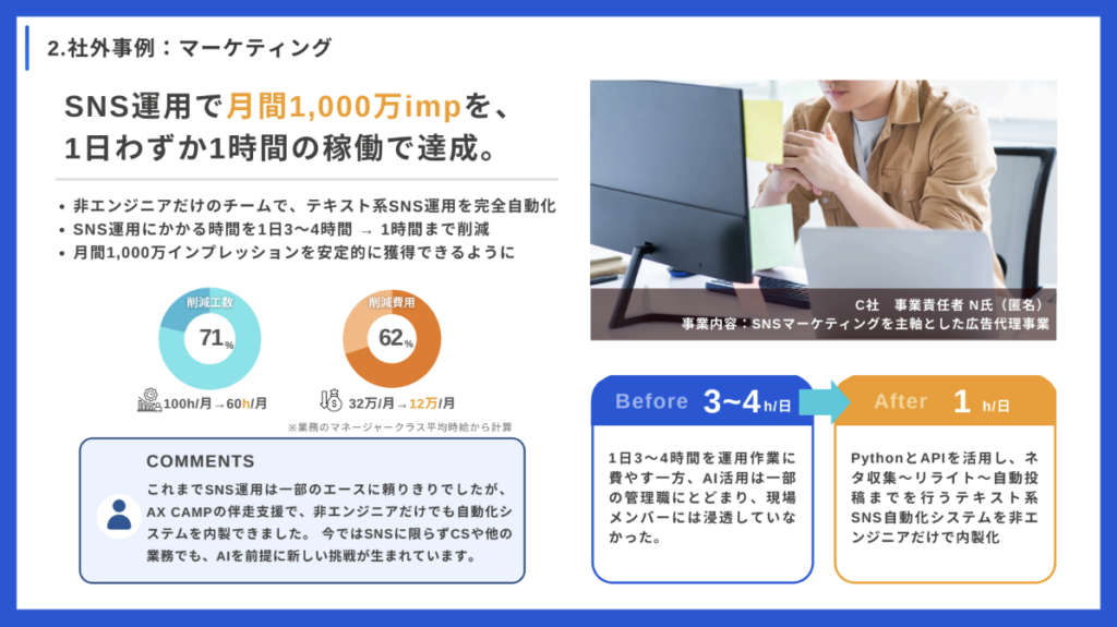 すべての事例で、プログラミング経験のないメンバーがAI化を実現しています。「エンジニアがいないから無理」という言い訳は通用しません。
