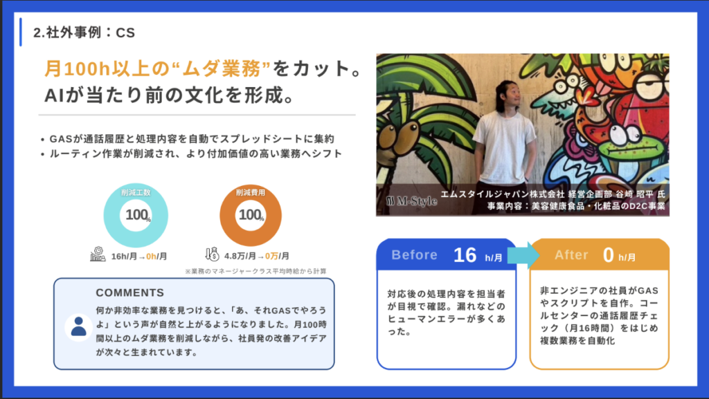 「何か非効率な業務を見つけると、『あ、それGASでやろうよ』という声が自然と上がるようになりました。月100時間以上のムダ業務を削減しながら、社員発の改善アイデアが次々と生まれています。」