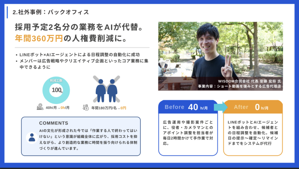 「AIの文化が形成された今では『作業する人で終わってはいけない』という意識が組織全体に広がり、採用コストを抑えながら、より創造的な業務に時間を振り向けられる体制づくりが進んでいます。」