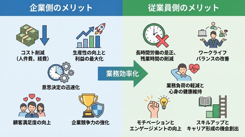 業務効率化は、企業と従業員の双方に大きなメリットをもたらします。企業にとってはコスト削減や競争力強化に直結し、従業員にとっては働きがいや満足度の向上につながる、まさにWin-Winの施策です。